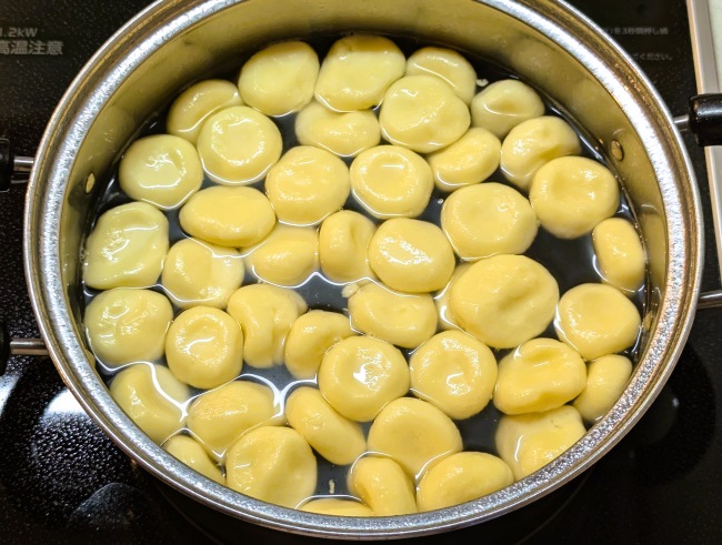 5.鍋にお湯を沸かし団子の生地を入れて茹でて、水面に完全に浮き上がるまで茹でます。(約3分前後)