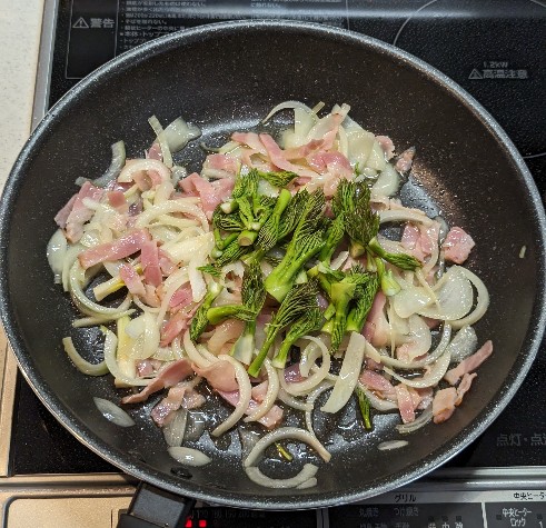 7.玉ねぎが透きとおってきたら、タラの芽を入れて炒めます。