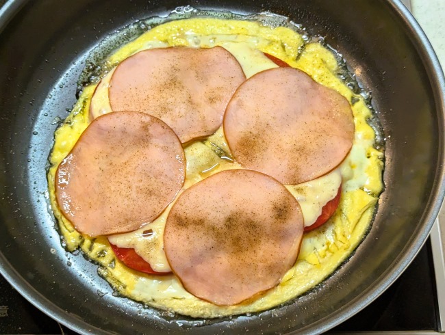 5.弱火の中火で火をつけ、トマト・チーズ・ハムの順番に載せて塩コショウを振ります。